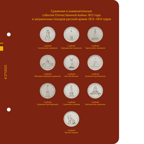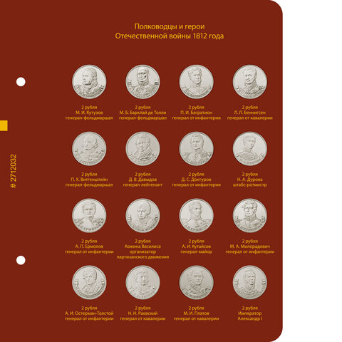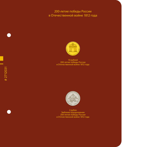 Альбом предназначен для коллекционирования монет Российской Федерации, посвящённых 200-летию победы России в Отечественной войне 1812 года, которые включают в себя монеты: «200-летие победы России в Отечественной войне 1812 года» — 10 рублей, «Эмблема празднования 200-летия победы России в Отечественной войне 1812 года» — 2 рубля и серии: «Полководцы и герои Отечественной войны 1812 года», «Сражения и знаменательные события Отечественной войны 1812 года и заграничные походы русской армии 1813–1814 годов».