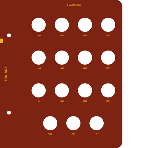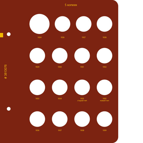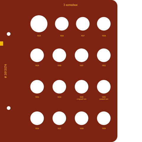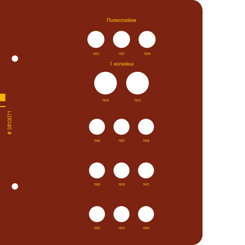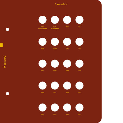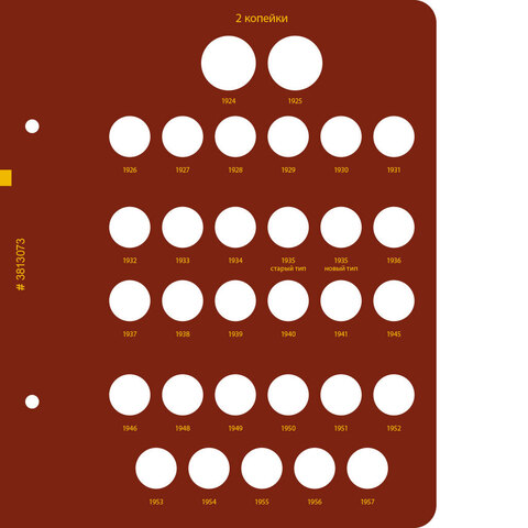 Монеты располагаются по номиналам. В рамках одного номинала монеты располагаются по хронологии выпуска. Под ячейками указываются год и уточнение типа монеты, в случае обозначения разновидности. В заголовке страницы указывается номинал.