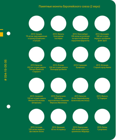 Монеты в альбоме располагаются в соответствии с хронологией выпуска, независимо от того какой страной они были выпущены. Также в альбоме предусмотрен лист временного хранения без подписей под ячейками.