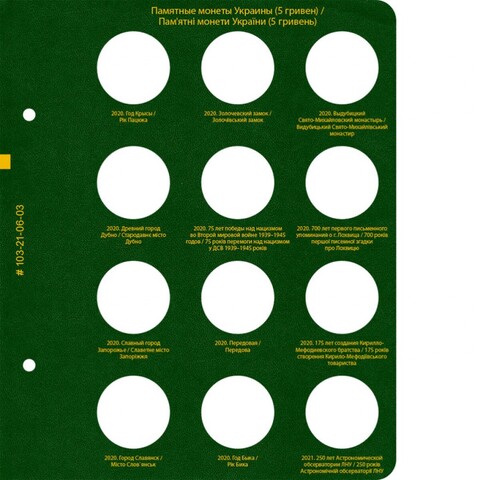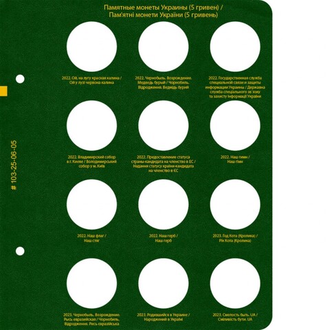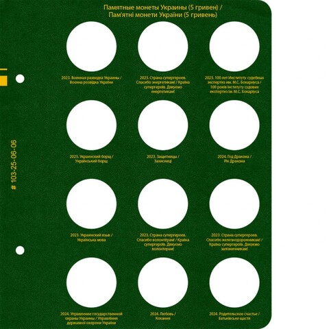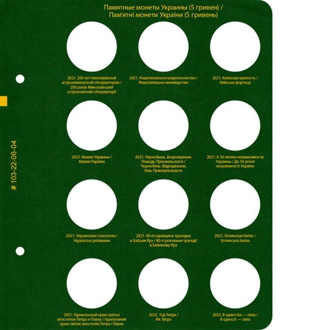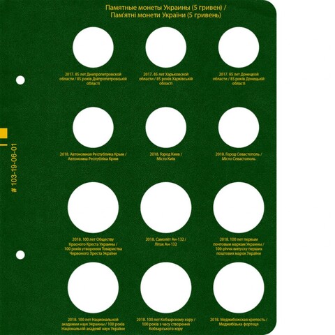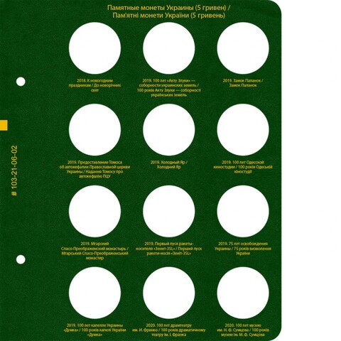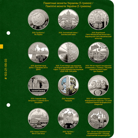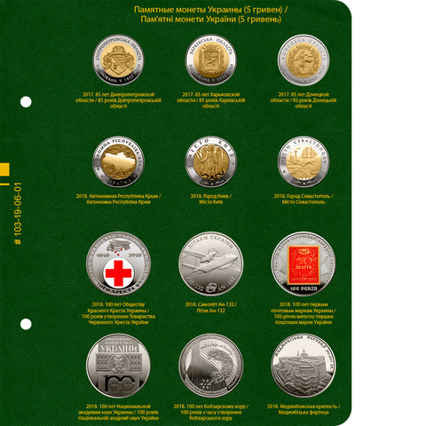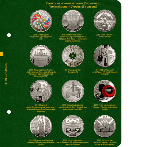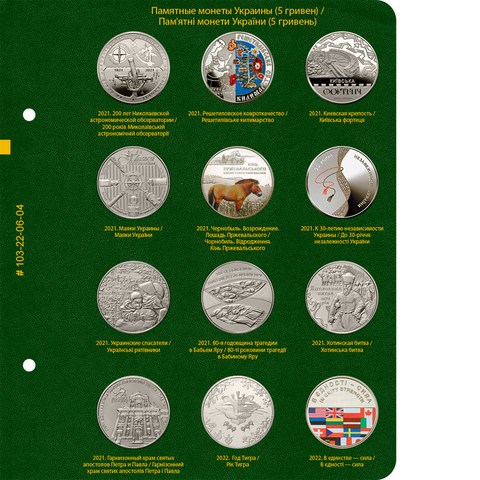 Под ячейками указываются год и название монеты на русском и украинском языках. Номинал на двух языках указывается в заголовке.