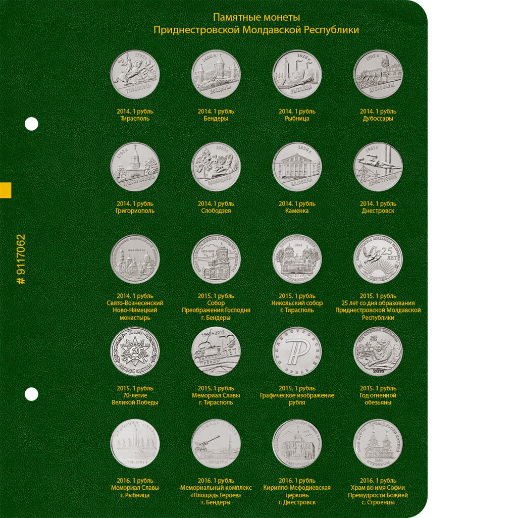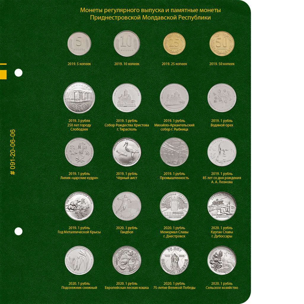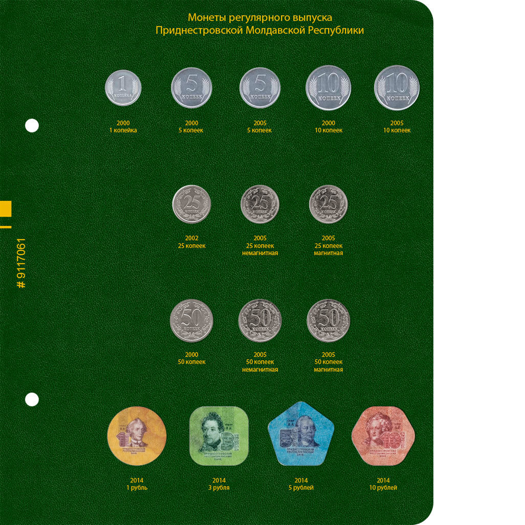 На первом листе расположены монеты регулярного выпуска 2000-2014 годов, в том числе монеты из композитных материалов. На втором и последующих листах расположены ячейки для памятных монет номиналом 1 рубль 2014-2020 гг. Монеты расположены по годам. В рамках года хронология выпуска может быть нарушена, с целью размещения крупных серий на одном листе. Например, таких как «Города Приднестровья (лист №2) и «Знаки зодиака» (лист №3). Для монет регулярного выпуска указываются год, номинал и разновидность (в случае наличия). Для памятных монет указываются год, номинал и название монеты.