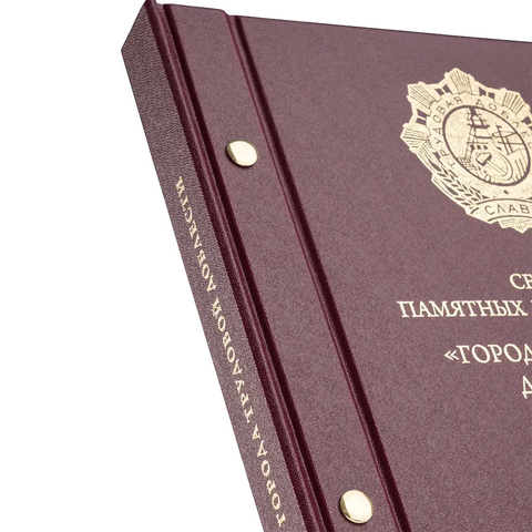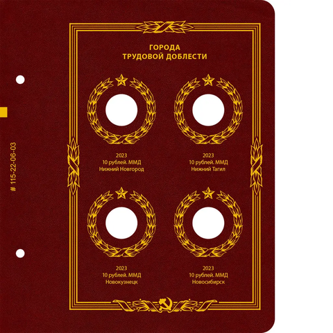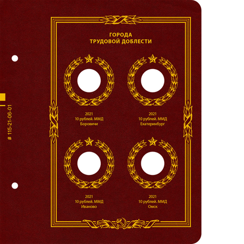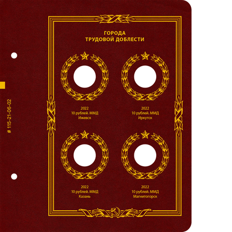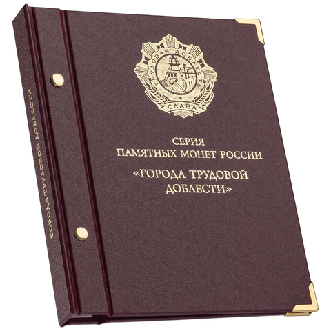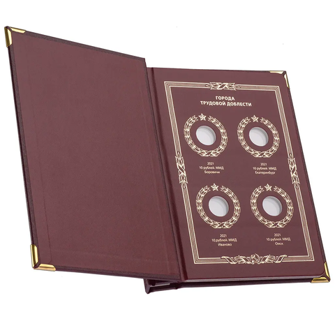 Альбом для коллекции памятных монет «Города трудовой доблести» номиналом 10 рублей с латунным гальваническим покрытием. Это новая серия монет, выпуск которой начинается в 2021 году. В 2020 году почетное звание "Город трудовой доблести" было присвоено 20 городам. Центральный банк России планирует выпускать по 4 монеты ежегодно, в 2021-2022 годах. На данный момент в альбоме 2 листа, где размещены ячейки для 8 городов: Боровичи, Екатеринбург, Иваново, Омск, Ижевск, Иркутск, Казань, Магнитогорск. В альбоме предусмотрено место для дополнительного листа на тот случай, если список городов расширится и будет выпущено больше 20 монет.