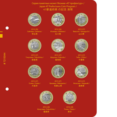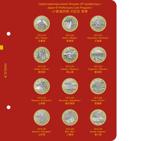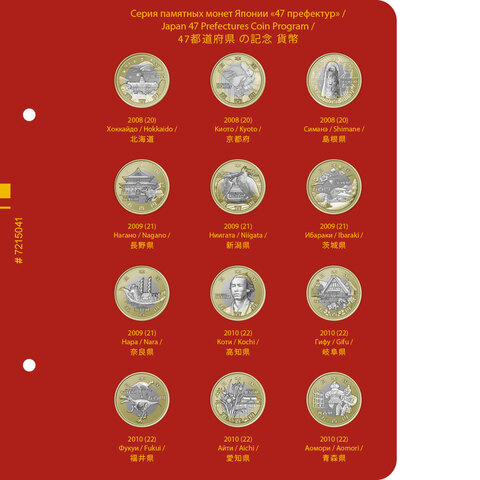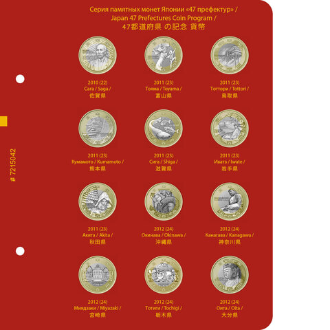 Альбом предназначен для хранения серии памятных монет Японии «47 префектур» номиналом 500 иен 2008−2016 годов выпуска.