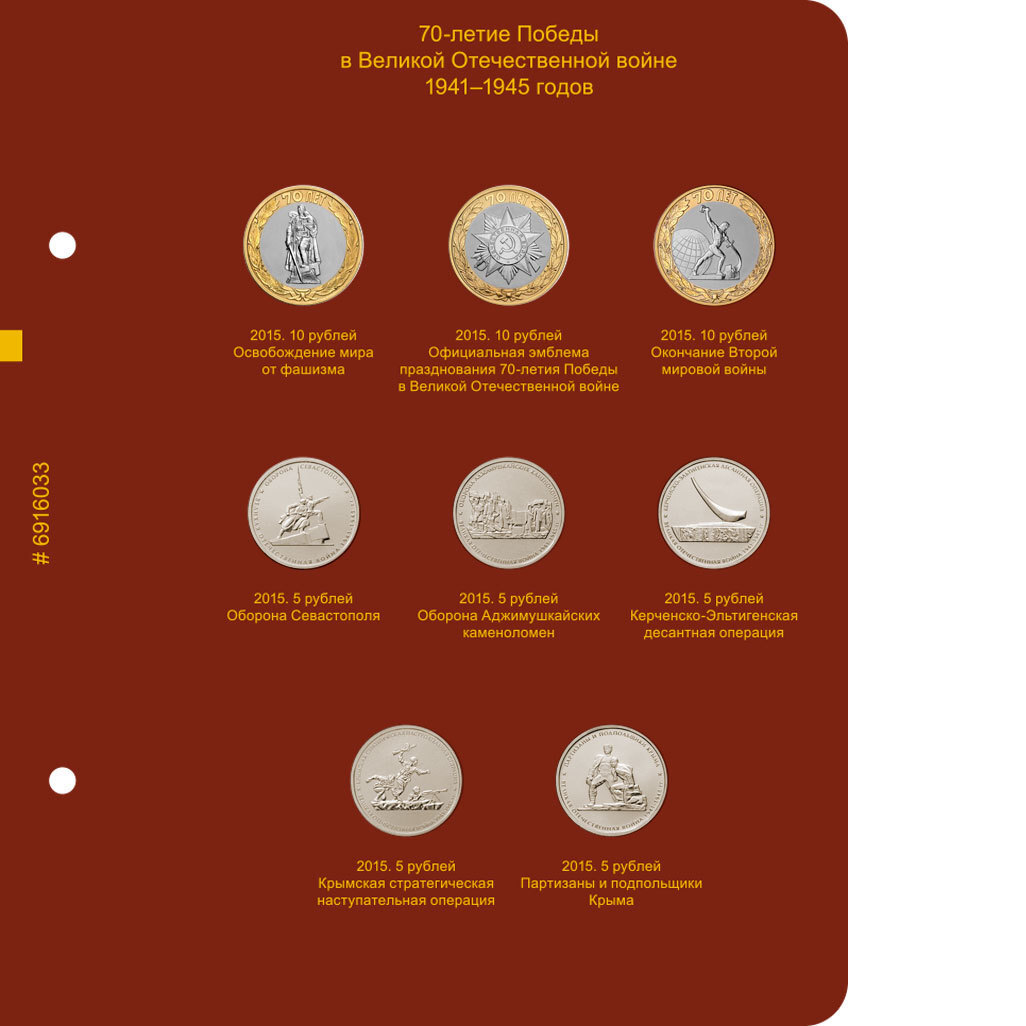 Альбом предназначен для хранения памятных монет России из недрагоценных металлов серии «70-летие Победы в Великой Отечественной войне 1941–1945 годов».