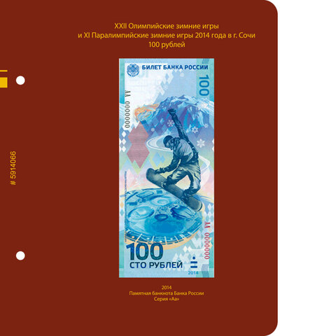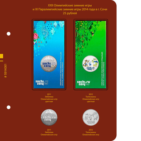 Альбом включает в себя 4 посадочных места для блистеров с цветными монетами, 4 посадочных места для нецветных монет, лист для 3-х монет, перевыпущенных в 2014 году и 3 листа для размещения 100 рублёвой памятной банкноты Банка России с олимпийской символикой (с учётом разновидности по сериям).