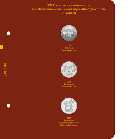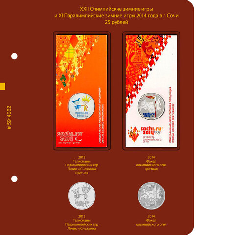 Альбом предназначен для коллекционирования памятных монет России «XXII Олимпийские и XI Паралимпийские зимние игры 2014 года в Сочи» номиналом 25 рублей, серия «Professional».