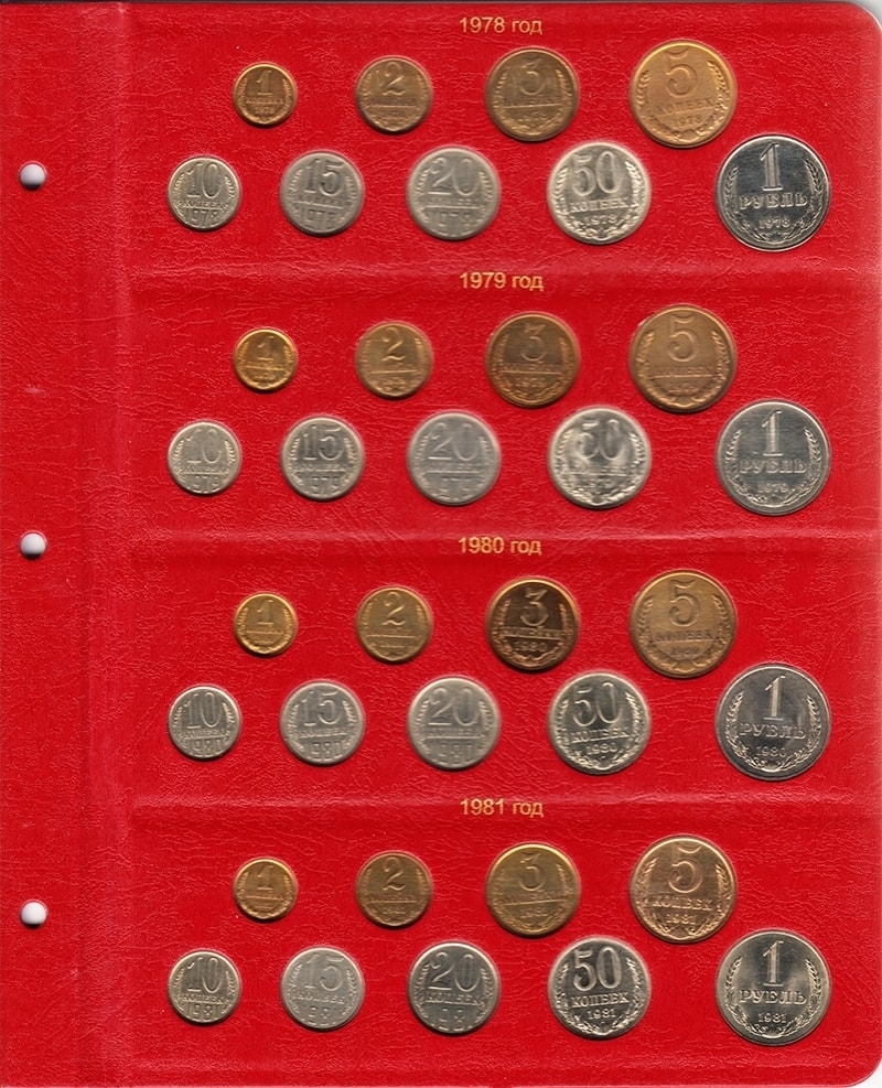В альбоме для погодовки монет 1961-1991 гг 291 ячейка под монеты, находившиеся в регулярном обращении в СССР достоинством в 1, 2, 3, 5, 10, 15, 20, 50 копеек и 1 рубль.
