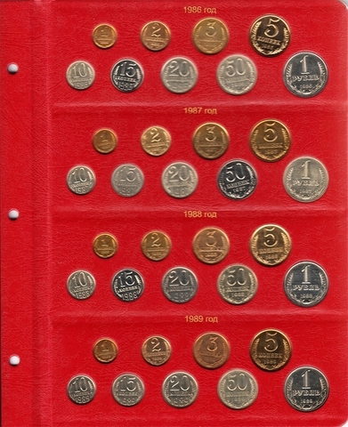 В альбоме для погодовки монет 1961-1991 гг 291 ячейка под монеты, находившиеся в регулярном обращении в СССР достоинством в 1, 2, 3, 5, 10, 15, 20, 50 копеек и 1 рубль.