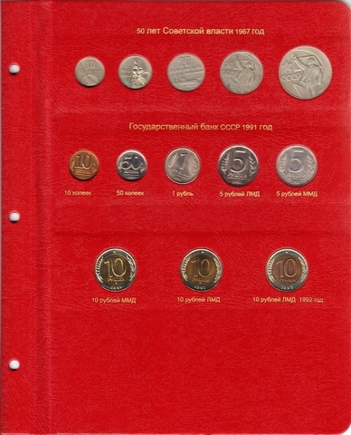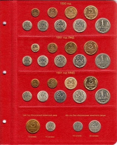 Для того, чтобы коллекция монет данного периода была достаточно полной, в альбом включены ячейки для монет 1990 г номиналами 5 и 10 копеек со знаком монетного двора, а также монеты 10 и 20 копеек 1991 г без знака монетного двора.