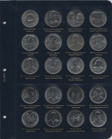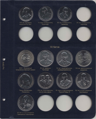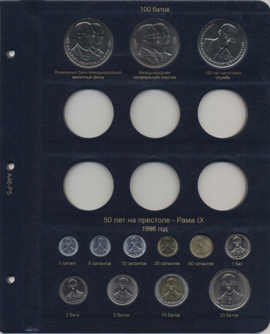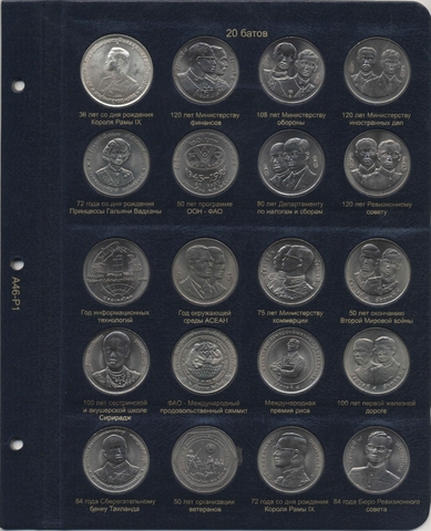 В этом альбоме собраны все памятные монеты из недрагоценных металлов достоинством 20, 50 и 100 батов, два листа посвящены современным регулярным монетам.