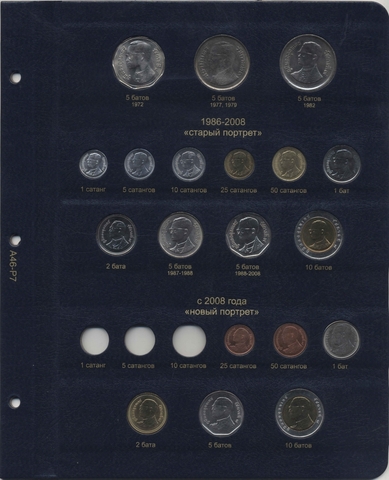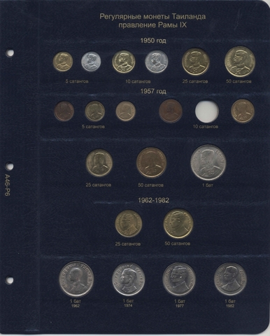 Два отдельных листа посвящены регулярных монетам Таиланда — разменным сатангам и батам, начиная с 1950 года.