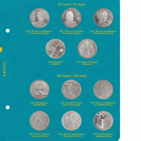 Монеты располагаются в том порядке, в котором они выпускались Национальном Банком Республики Казахстан, независимо от того к какой серии они относятся. На втором листе отражена смена номинала монет с 50 на 100 тенге. Несмотря на смену номинала, технические характеристики монет остались прежними.