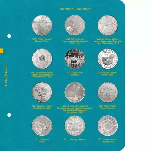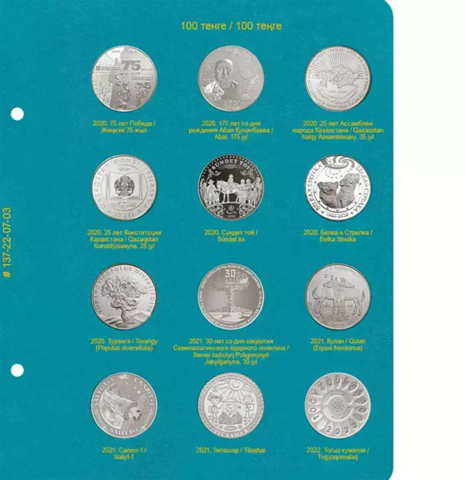 В альбоме учитываются памятные монеты Казахстана из недрагоценных металлов номиналами 50 и 100 тенге 2014-2022 гг. В альбоме нет ячеек для монет, которые были выпущены только в блистерах.