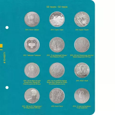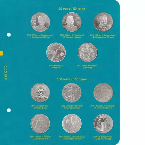 Под ячейками указываются год и название монеты на русском и казахском языках. Номиналы на двух языках указываются в заголовке. Альбом бирюзового цвета.