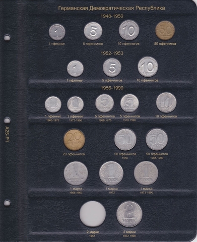 В альбоме Вы сможете разместить все типы регулярных монет ГДР, с 1949 года до 1990 года, когда произошло объединение Германий.