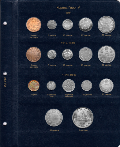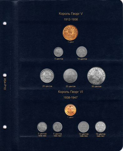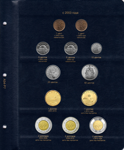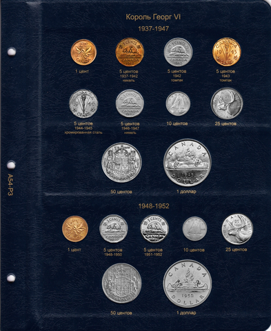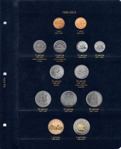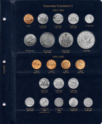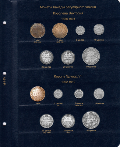 Альбом для монет Канады регулярного чекана включает в себя все выпускавшиеся монеты с 1858 года по настоящее время с разделением по типам, металлам и портретам правителя.