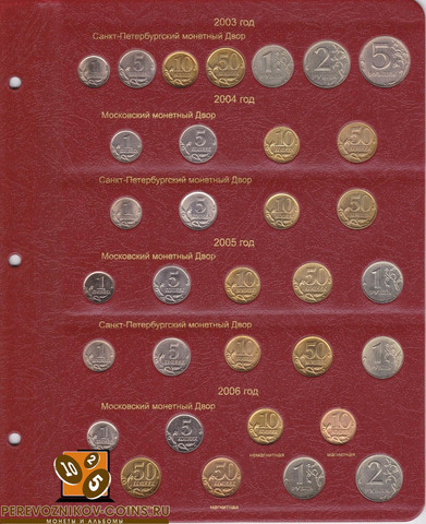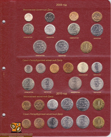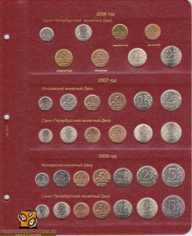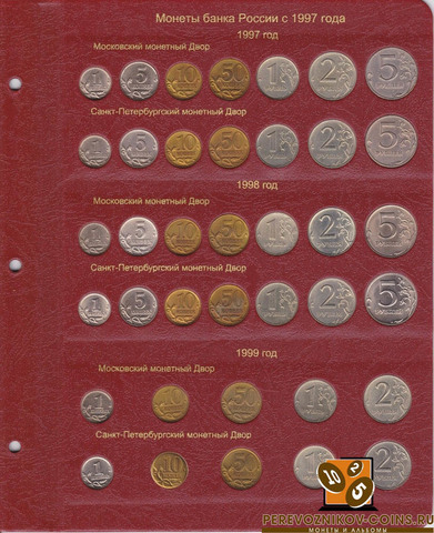 Альбом для регулярных монет России, начиная с 1997 года - теперь вся современная нумизматика в одном альбоме! Монеты России, начиная с 1997 года выпуска, сейчас являются наиболее доступными для коллекционеров, так как часто встречаются в обращении, что неудивительно, ведь их ежегодно чеканят два монетных двора. В данном альбоме Вы сможете разместить все монеты России регулярного чекана с разбивкой по годам и с разделением на Московский и Санкт-Петербургский монетные дворы.