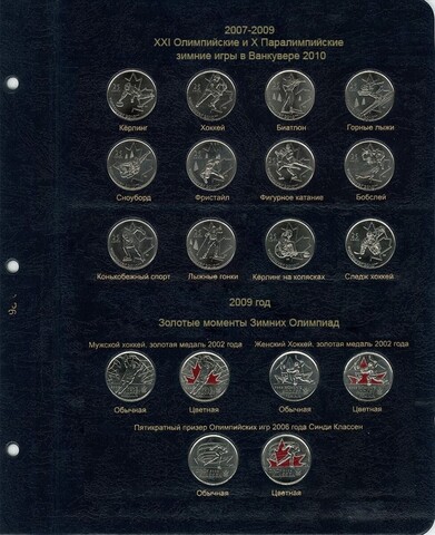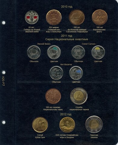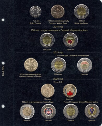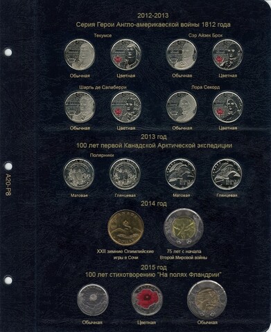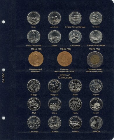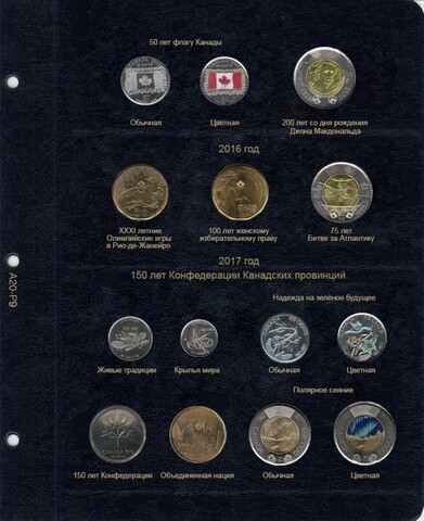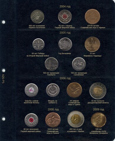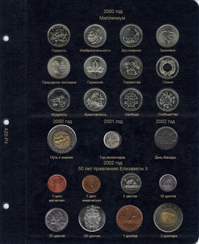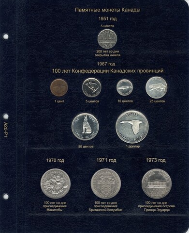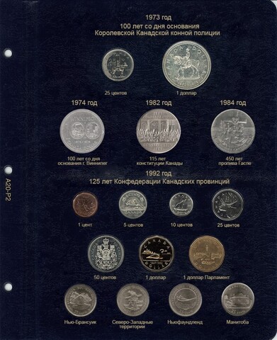 В данный альбом Вы сможете собрать все юбилейные монеты Канады, выпущенные с 1951 года по настоящее время. Компоновка альбома состоит как из годовых наборов и серий, так и из единичных выпусков юбилейных монет. Данный альбом в стандартной компоновке не предусматривает серию однодолларовых серебряных монет, кроме двух наборных монет 1967 и 1973 годов выпуска.