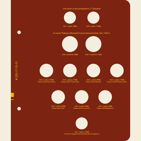 Вместительный альбом для юбилейных монет России с 1999 по 2014 года. Первый том состоит из 12 листов. Под каждой ячейкой указываются год, номинал, монетный двор и название монеты.