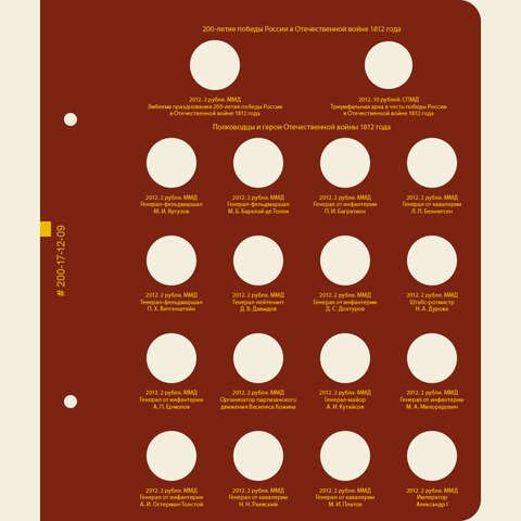 Строгий стиль, приятная на ощупь текстура альбома, благородный бордовый цвет и золотое тиснение подчеркивают красоту каждой монеты в альбоме. Запатентованная система крепления листов в альбоме исключает вероятность вырывания листов по отдельности или блока целиком под тяжестью монет.