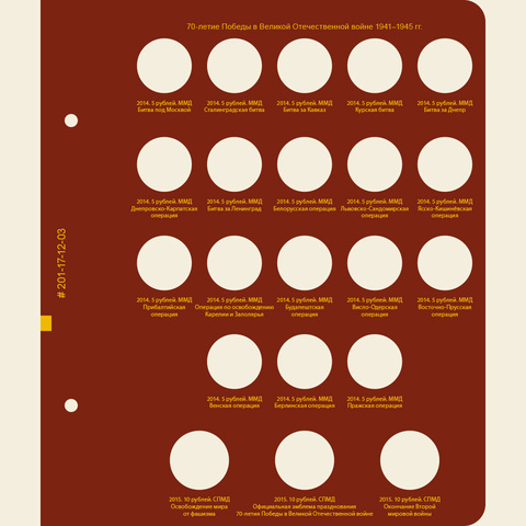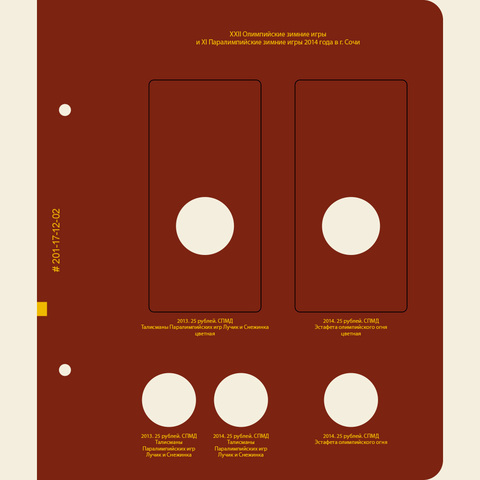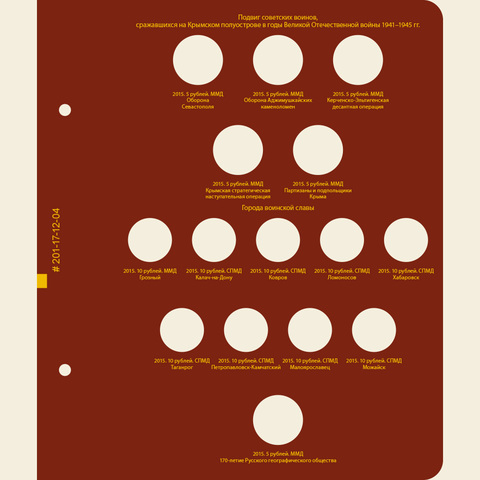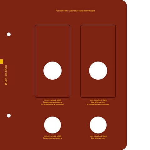 Вместительный альбом для коллекции памятных монет России с 2014 года по настоящее время. В альбоме учитываются все памятные монеты России из недрагоценных металлов с 2014 года номиналами 1, 2, 5, 10 и 25 рублей, в т.ч. монеты из серии «Футбол» и «Советская мультипликация». Является продолженим в виде 1-го тома.
