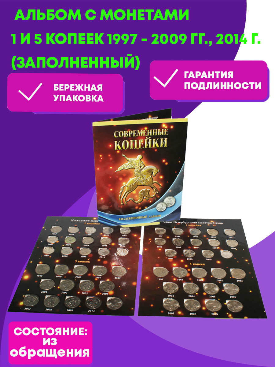 Альбом с монетами регулярного чекана РФ 1 и 5 копеек. 1997-2009 гг., 2014 г. (Заполненный)
