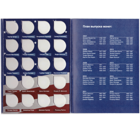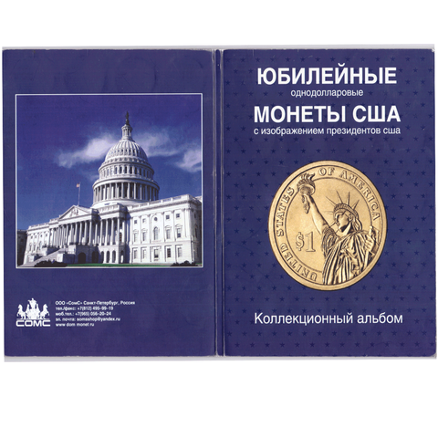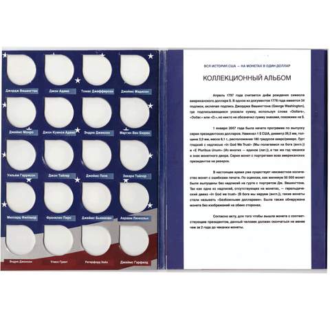 Альбом юбилейный однодолларовые монеты США (президенты США) предназначен для однодолларовых монет серии "Президенты США".
