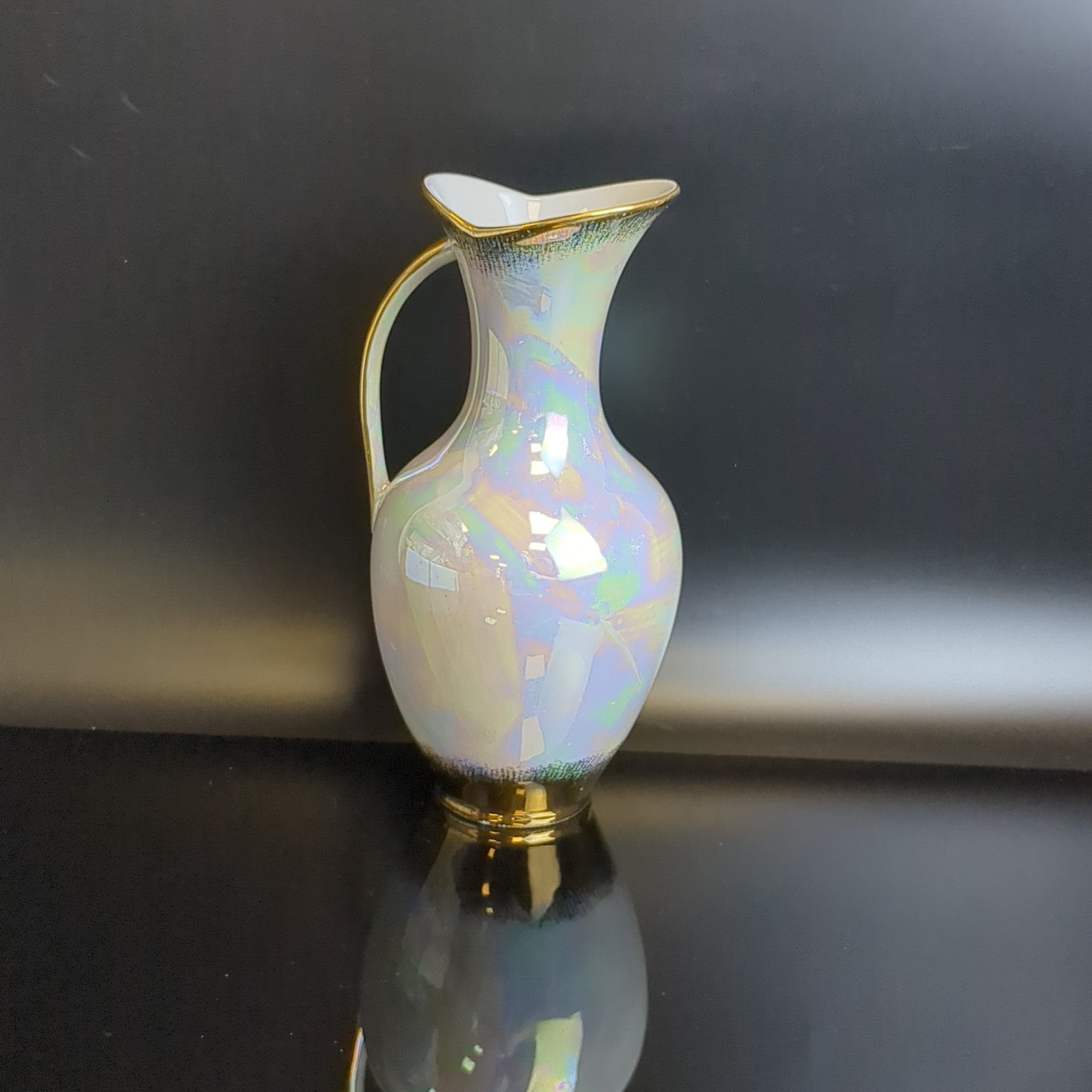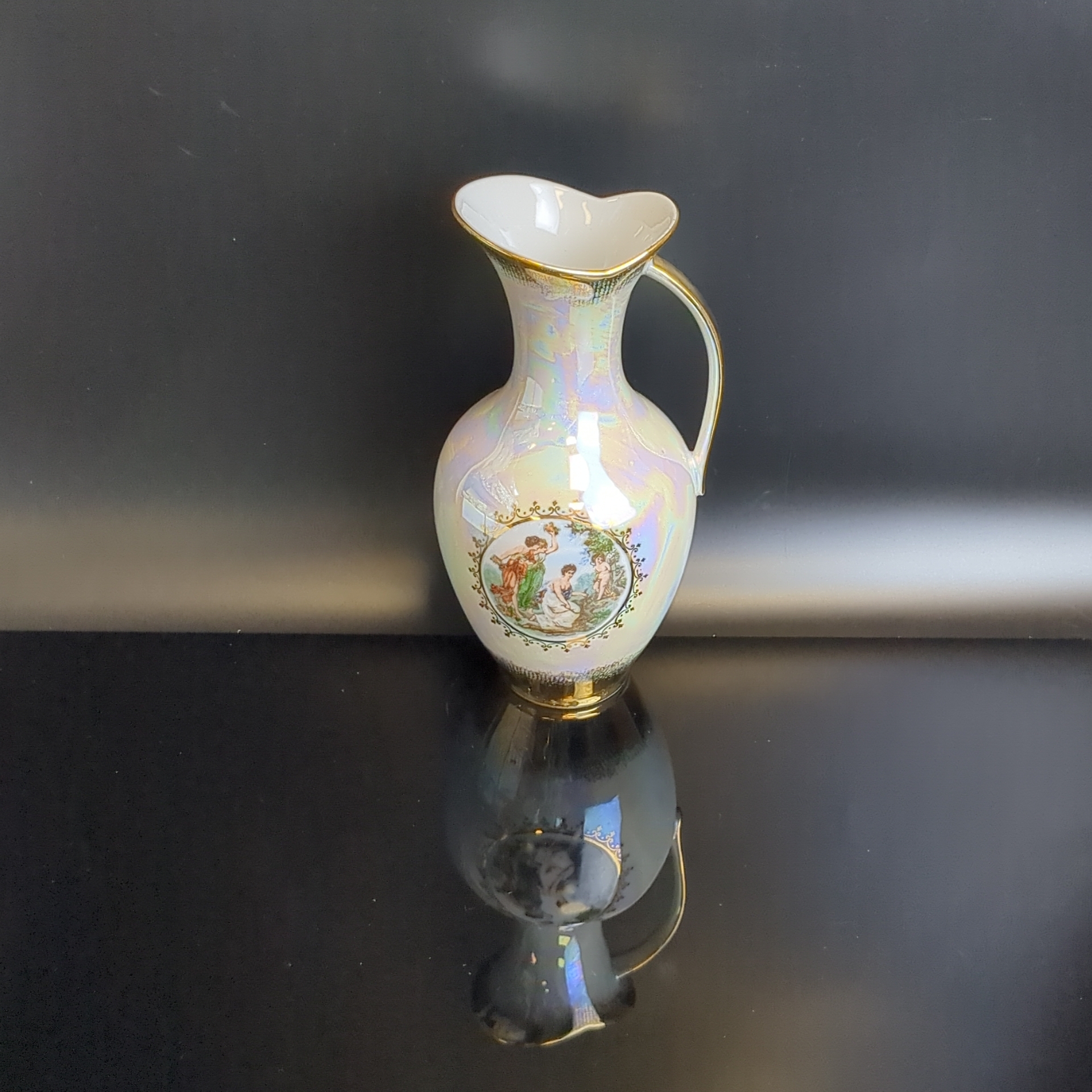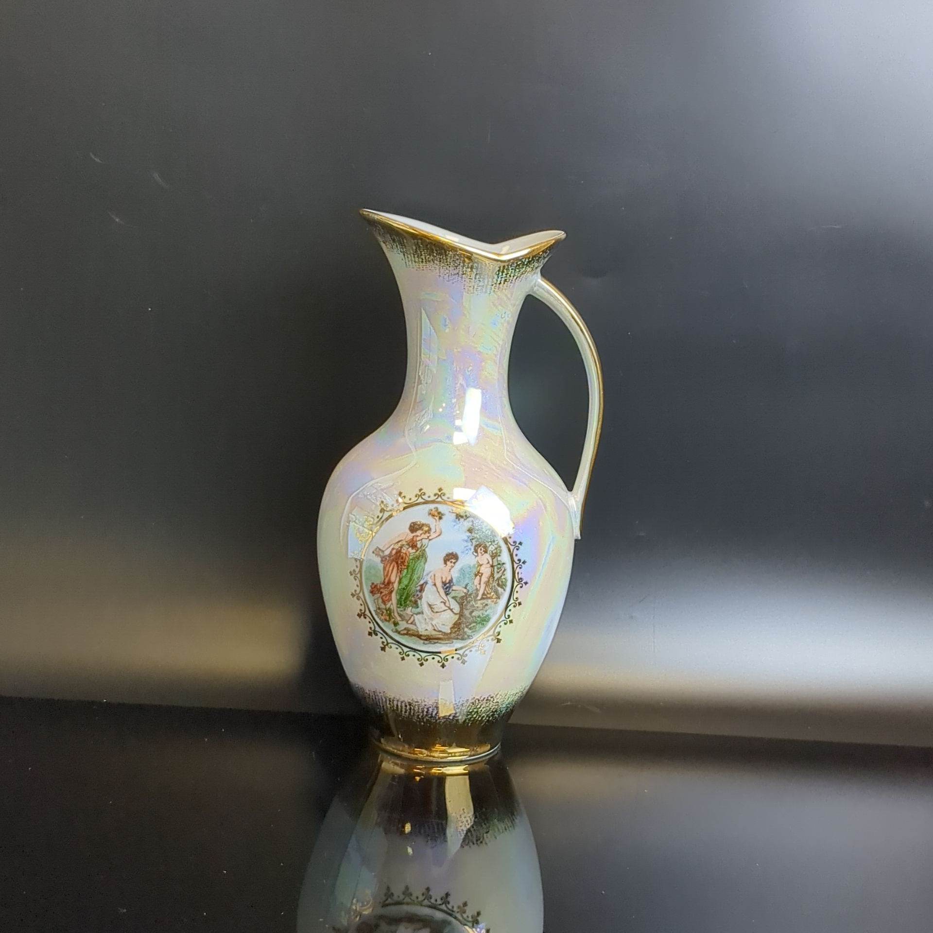Ваза-кувшин «Мадона» из Германии эпохи ГДР, Martinroda в 1950–1960-х годах. Люстровая роспись, изысканная позолота и изящные формы создадут атмосферу утончённости вашего интерьера. Уникальный подарок ценителям красоты и истории! Емкость 500 мл, высота всего 18 см – идеально впишется даже в небольшое пространство.