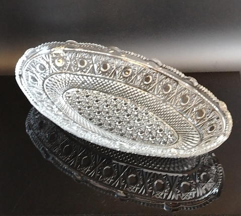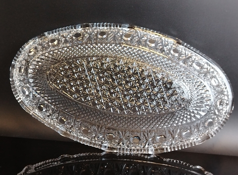 Антуражное шикарное хрустальное большое блюдо для сервировки, алмазная грань, геометрический изящный орнамент, винтаж СССР 1970-1990 гг. Высота - 5.5 см, длина - 35.5 см, ширина - 20 см.