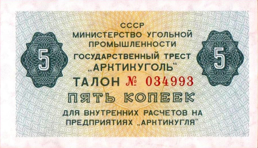Талон для внутренних расчетов на предприятиях «Арктикуголь» на сумму 5 копеек.