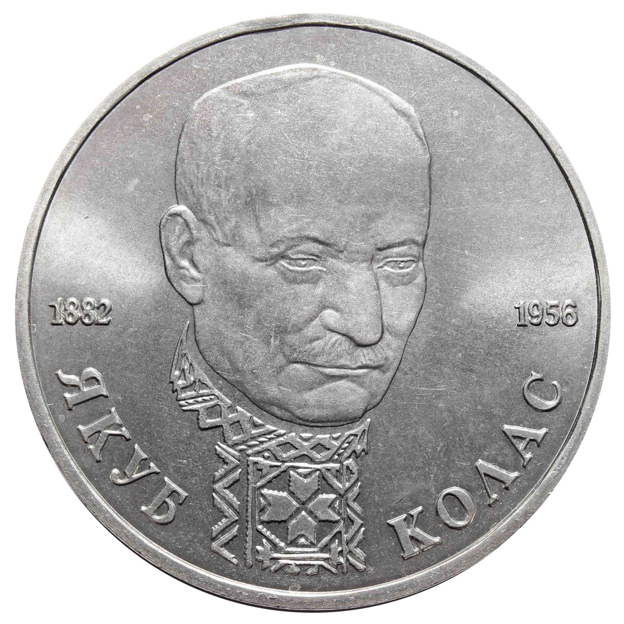 Реверс: Изображение Я. Коласа в рубашке с национальным орнаментом, слева и справа от него - даты "1882" "1956", внизу по окружности - надпись: "Якуб Колас".
