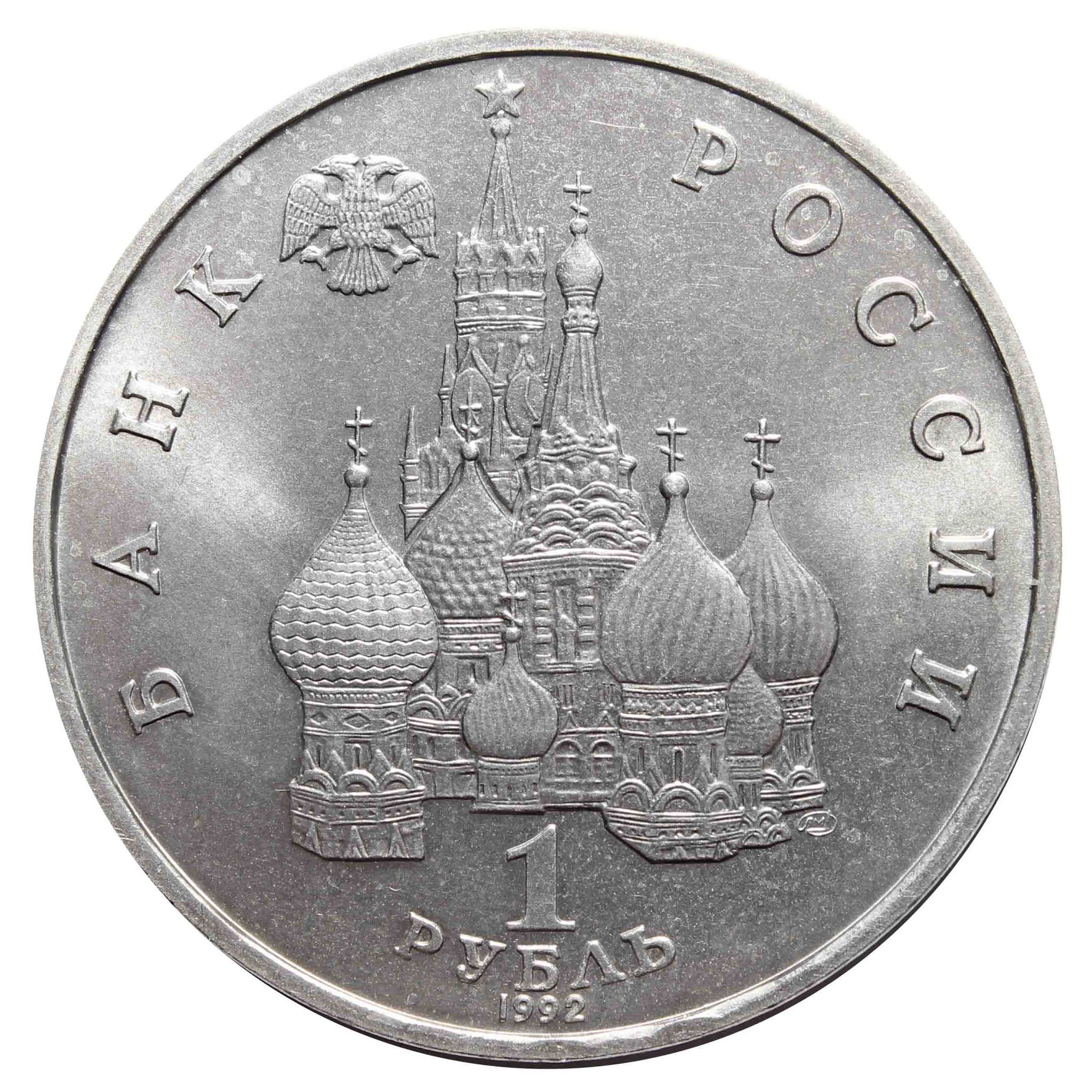 Аверс: Сверху слева - небольшое изображение двухглавого орла, слева - слово «Банк», справа - «России», внизу - обозначение достоинства монеты - цифра «1», под ним слово «рубль», ниже год выпуска монеты «1992», в середине - Собор Покрова Пресвятой Богородицы (собор Василия Блаженного) и за ним Спасская башня Московского Кремля, чуть ниже и правее - монограмма монетного двора «ЛМД».