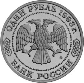 Аверс: Вверху вдоль канта - номинал «Один рубль» и год выпуска «1993 г.», внизу - слова «Банк России». В середине - двуглавый орел, под ним справа - монограмма монетного двора «ММД».