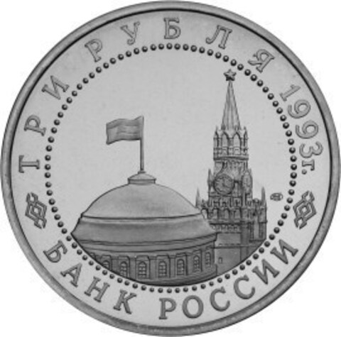 Аверс: в центре диска – изображения купола здания Сената и Спасской башни Московского Кремля, справа от них – товарный знак монетного двора. По окружности надписи, обрамленные кругом из точек: вверху – «Три рубля 1993 г.», внизу – «Банк России».