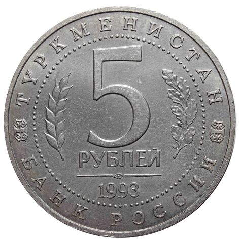 Аверс: В центре диска - надпись в две строки: "5 Рублей", слева и справа от неё - лавровая и дубовая ветви, под словом "Рублей", в центре прерывистой линии - товарный знак монетного двора, ниже - дата: "1993". По окружности надписи, обрамлённые кругом из точек: вверху - "Туркменистан", внизу - "Банк России".