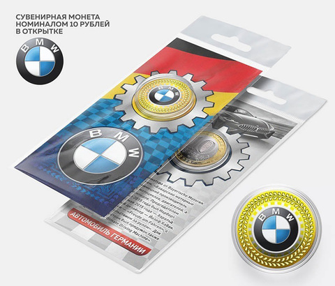 Автомобильная сувенирная монета 10 рублей - BMW в подарочной открытке