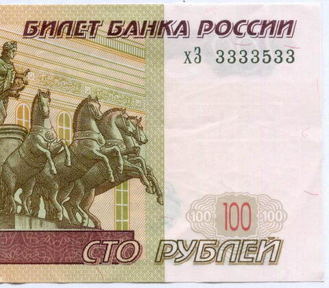 Банкнота 100 рублей 1997 год. Модификация 2004 года. Красивый номер - хЗ 3333533. VF-XF