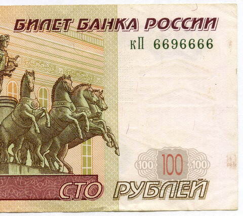 Банкнота 100 рублей 1997 год. Модификация 2004 года. Красивый номер - кП 6696666. VF-XF