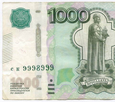 Банкнота 1000 рублей 1997 год. Модификация 2010 года. Красивый номер (радар) - ск 9998999. VF