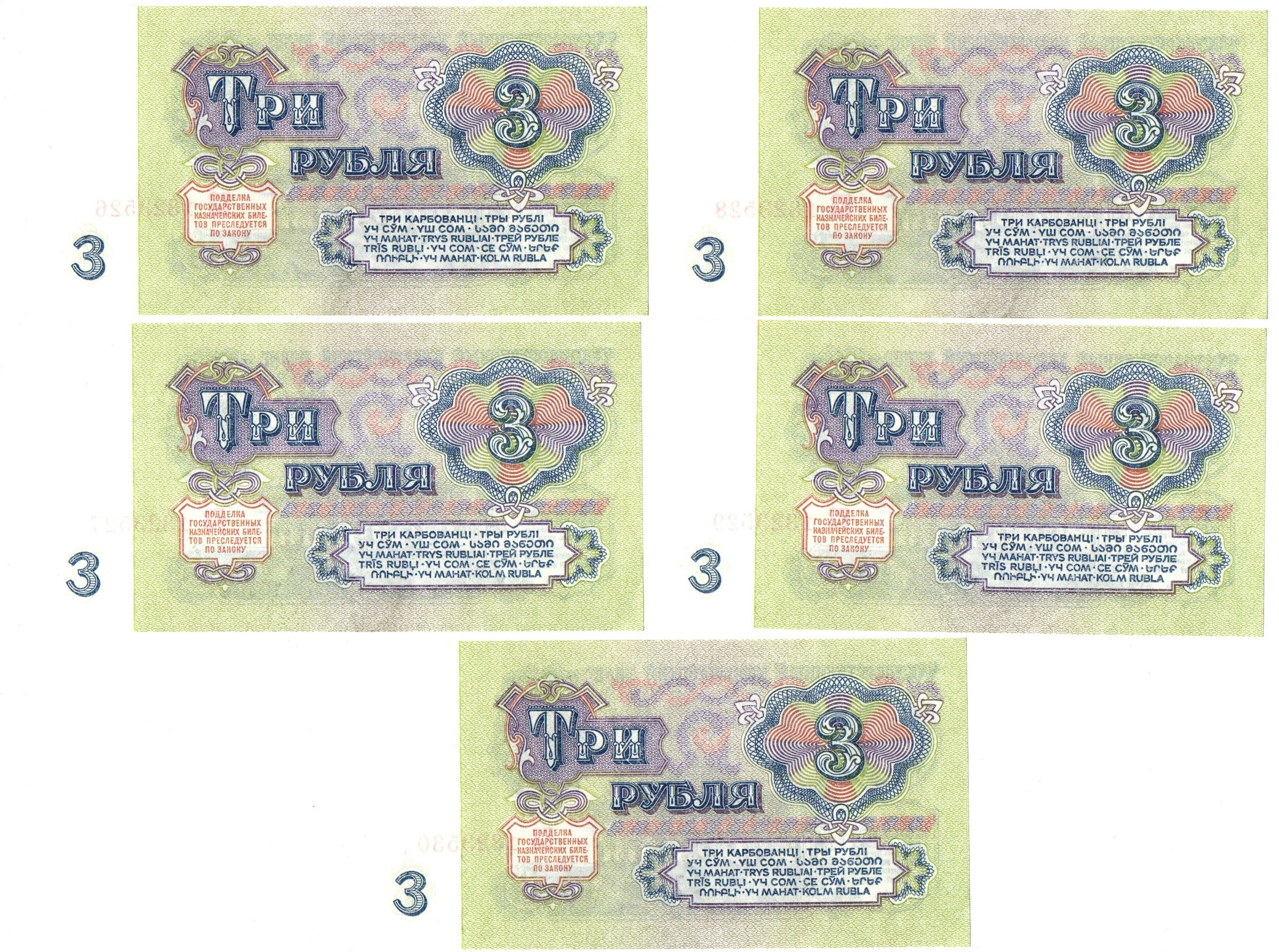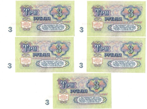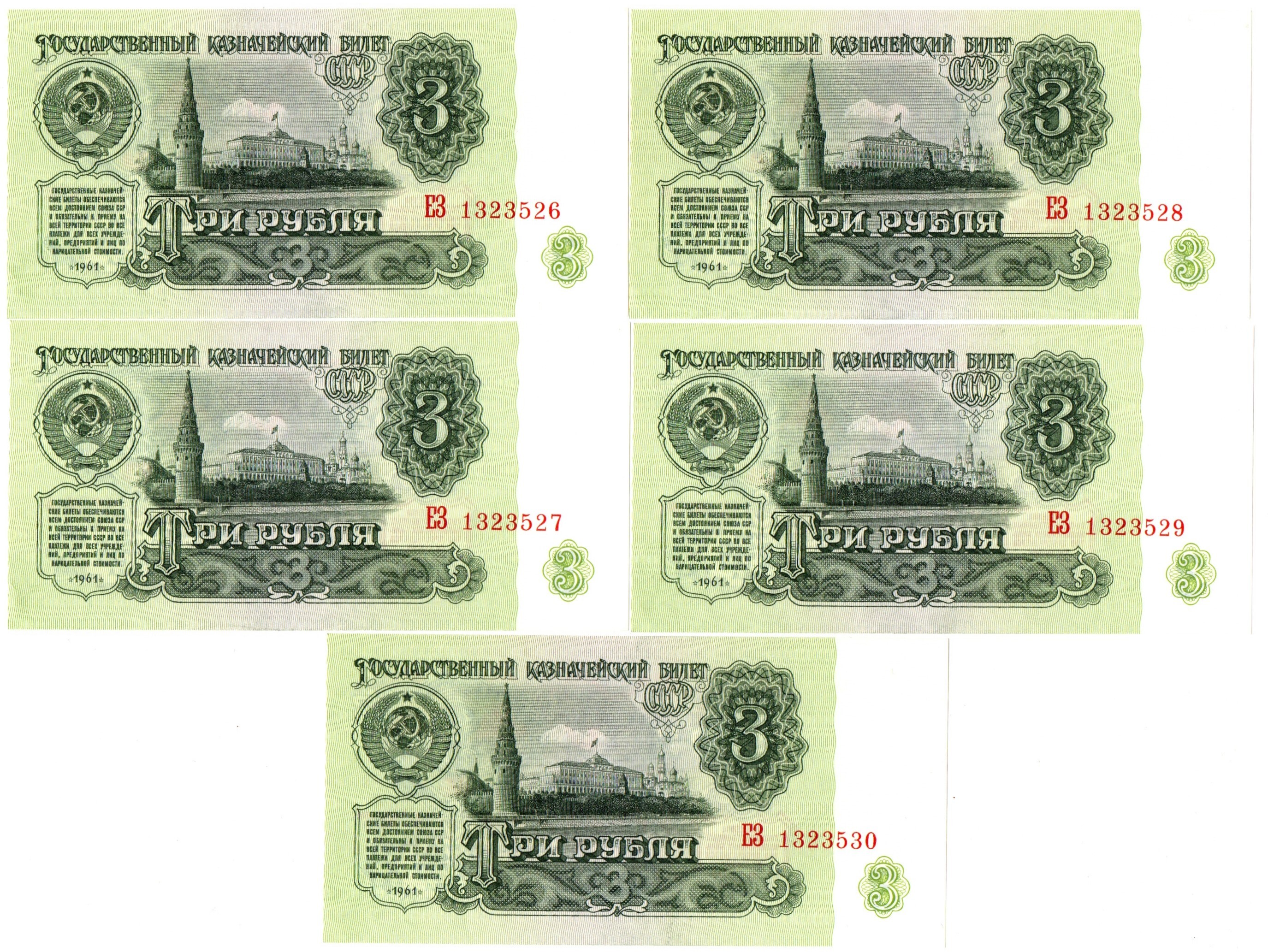 Банкнота 3 рубля 1961 год - 5 штук номера подряд - ЕЗ 1323526-1323530 - UNC - Пресс