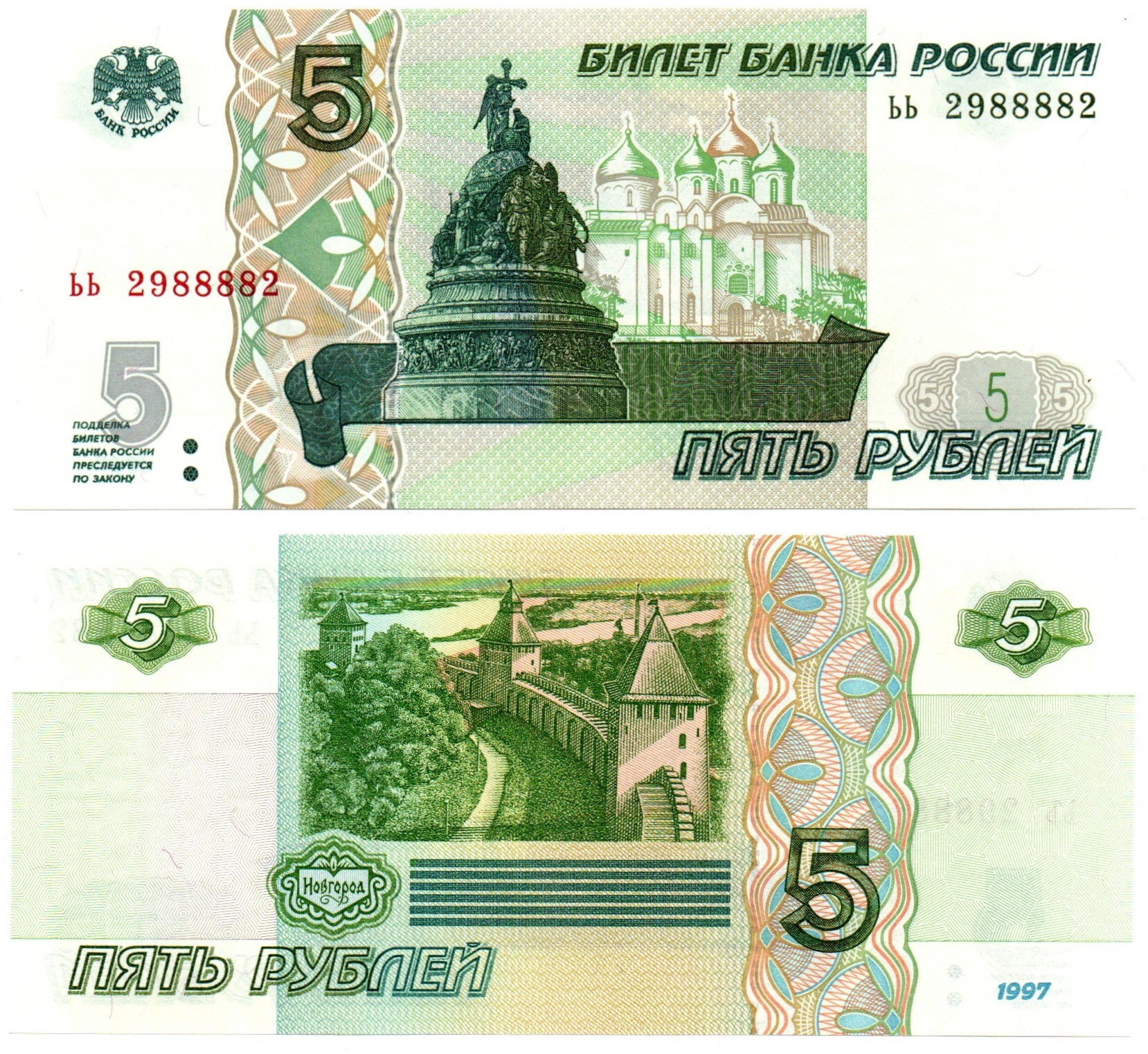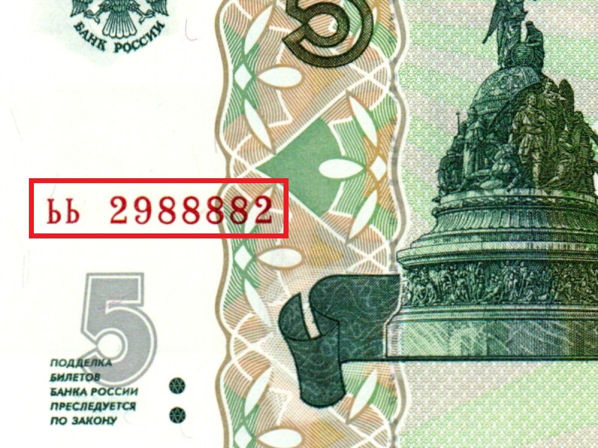 Банкнота 5 рублей 1997 г. Красивый номер ЬЬ 2988882. Пресс UNC