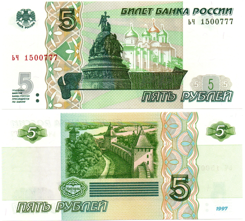 Банкнота 5 рублей 1997 г. Красивый номер ЬЧ 1500777. Пресс UNC