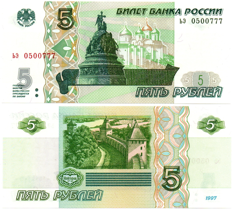 Банкнота 5 рублей 1997 г. Красивый номер ЬЭ 0500777. Пресс UNC