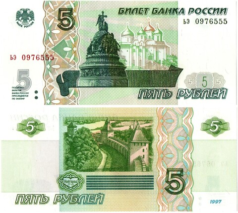 Банкнота 5 рублей 1997 г. Красивый номер ЬЭ 0976555. Пресс UNC