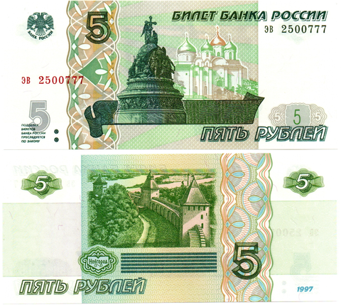 Банкнота 5 рублей 1997 г. Красивый номер ЭВ 2500777. Пресс UNC