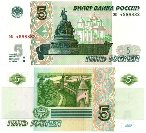 Банкнота 5 рублей 1997 г. Красивый номер ЭВ 4988882. Пресс UNC