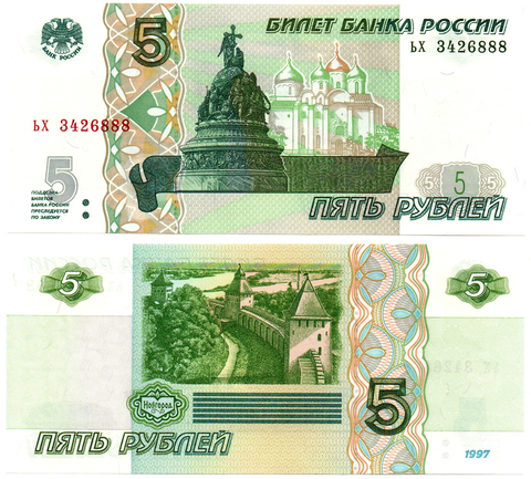 Банкнота 5 рублей 1997 г. Красивый номер ЬХ 3426888. Пресс UNC