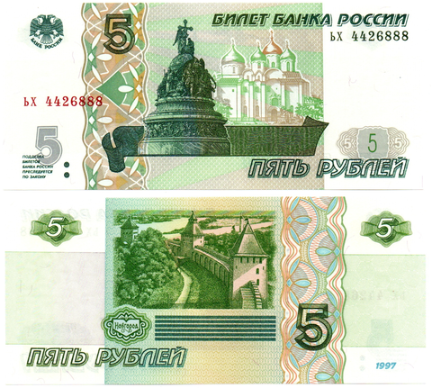 Банкнота 5 рублей 1997 г. Красивый номер ЬХ 4426888. Пресс UNC