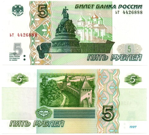 Банкнота 5 рублей 1997 г. Красивый номер ЬТ 4426888. Пресс UNC