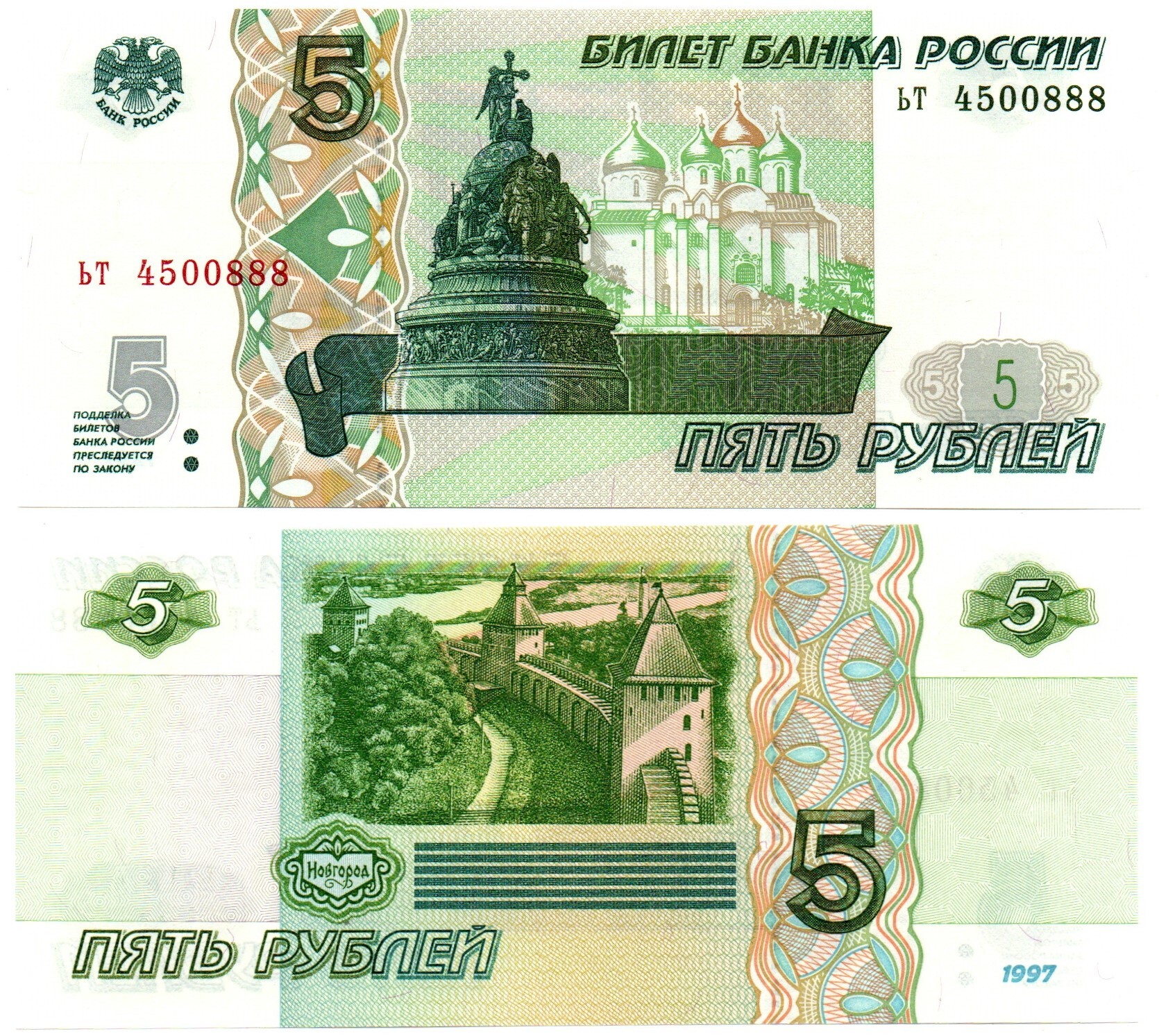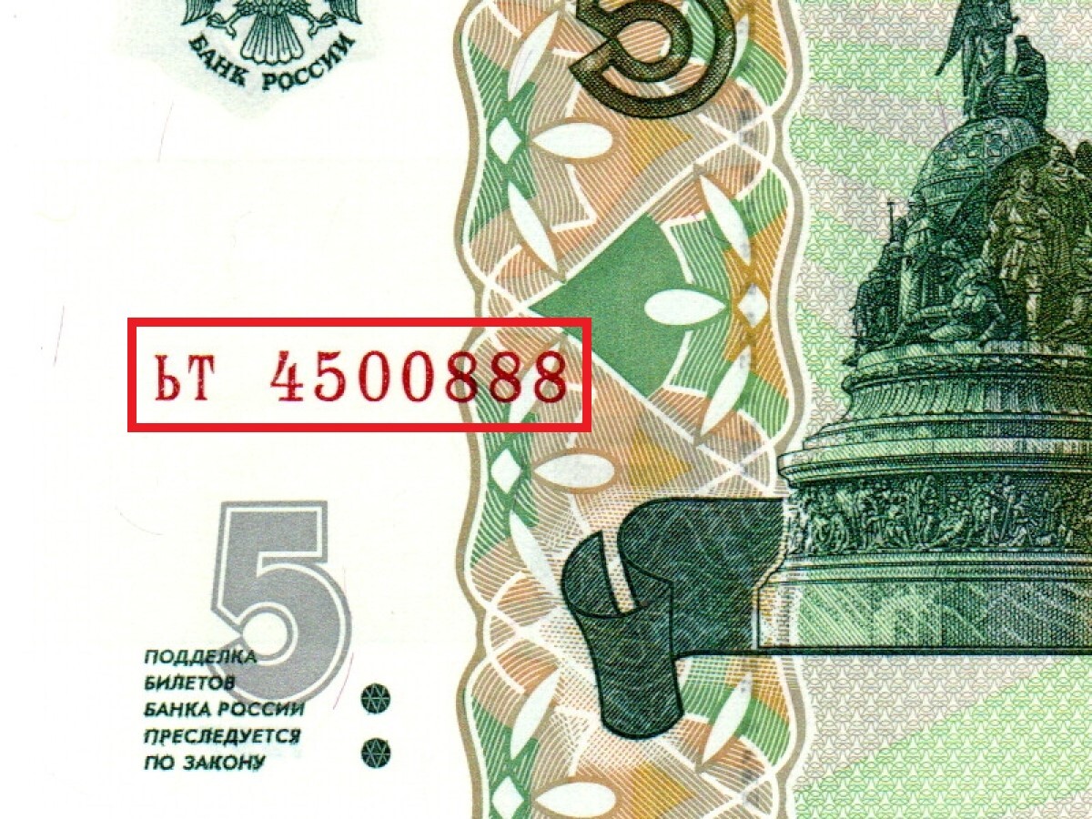 Банкнота 5 рублей 1997 г. Красивый номер ЬТ 4500888. Пресс UNC